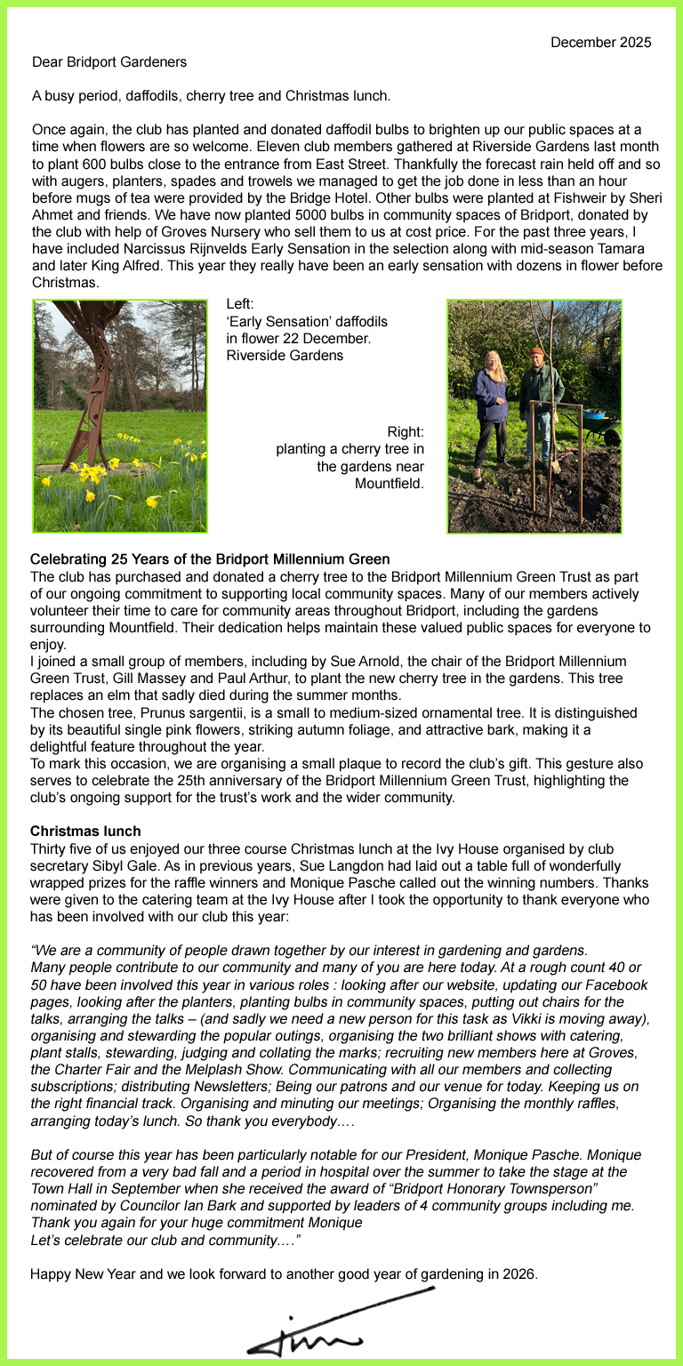 For those wishing to get in touch with club officers, contact information is available in the club’s Newsletter or email bridportgardeningclub@gmail.com.
